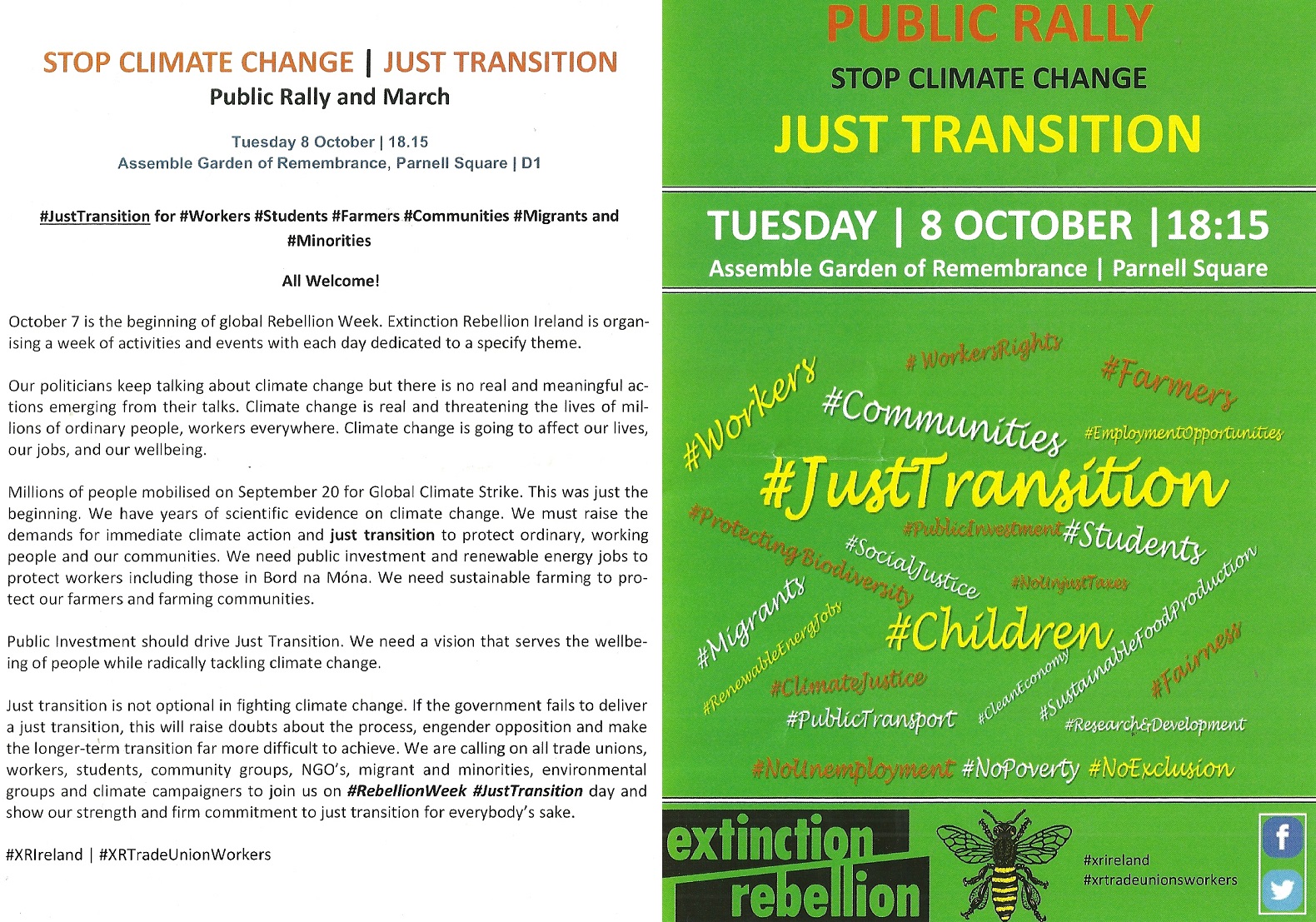Two Leaflets from Extinction Rebellion Ireland advertising a Rally on the 8th of October 2019 and the International Rebellion Week beginning 7th October 2019.