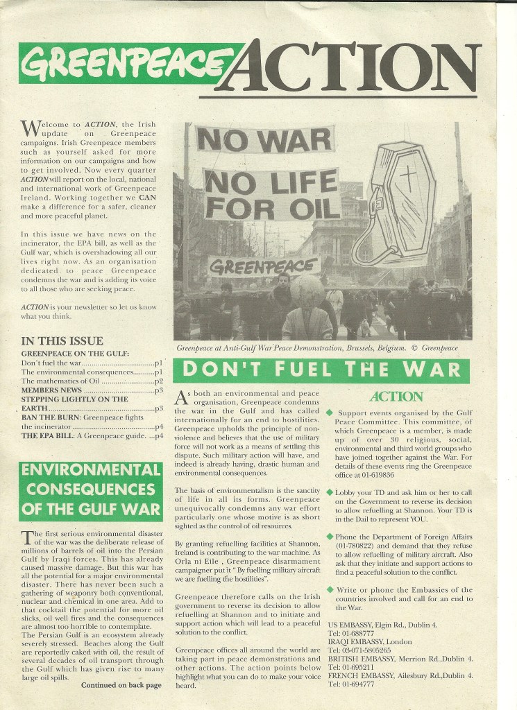 From 1991 , the first issue of Greenpeace Action, the newsletter of Greenpeace in Ireland. Also included in the scan is a petition regarding Whales. Many thanks to the sender.