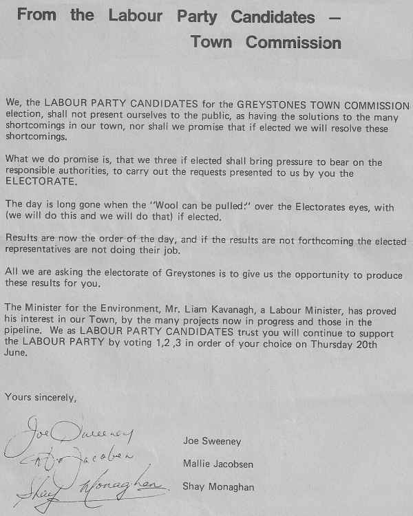 From the 1985 election for Greystones Town Commission a Letter to voters from Labour candidates Joe Sweeney, Mallie Jacobsen and Shay Monaghan.