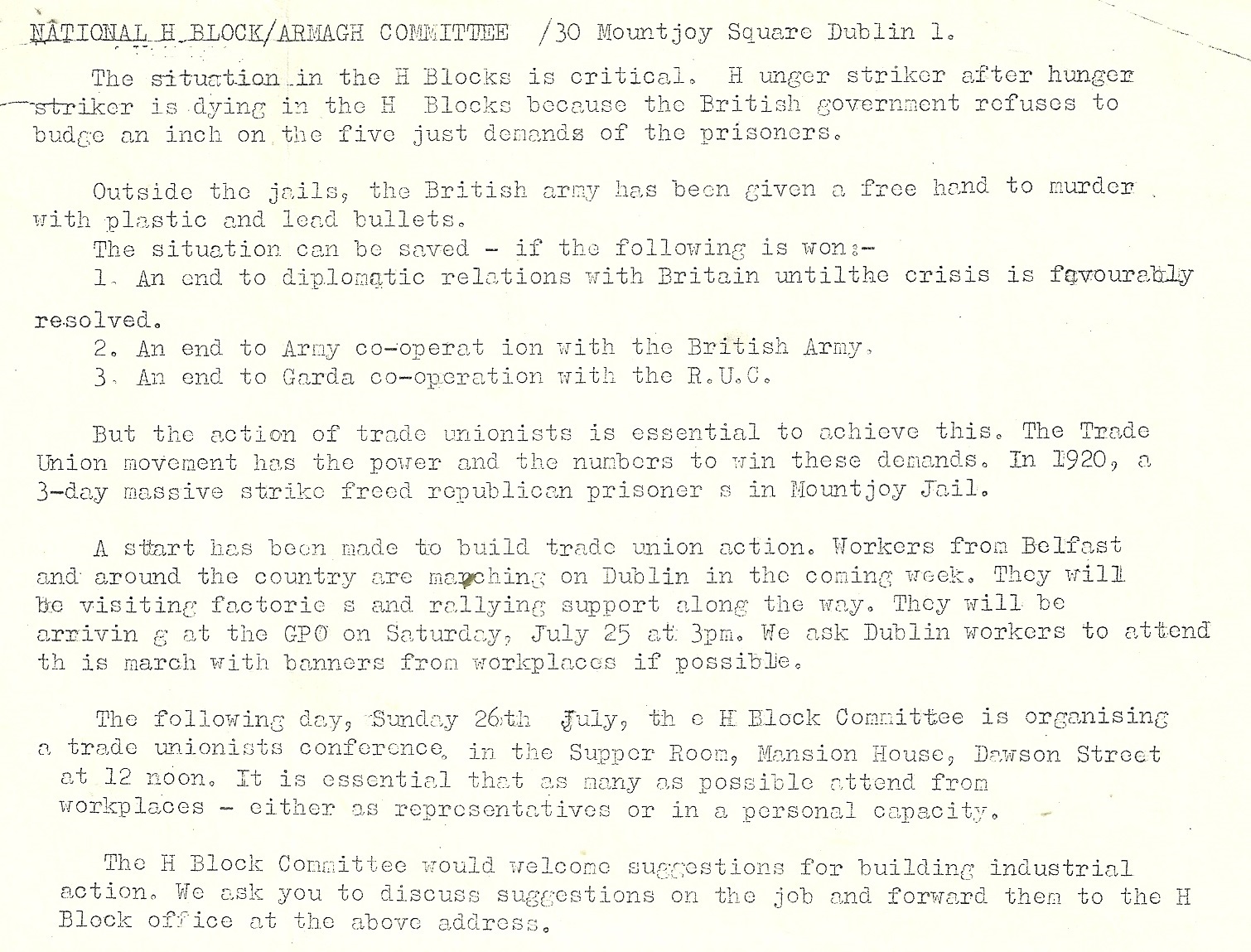 From July 1981 (at which stage six of the Hunger Strikers had died) a leaflet from the H Block /Armagh Committee looking to build support among the Trade Union movement for the Hunger Strikers and their demands.