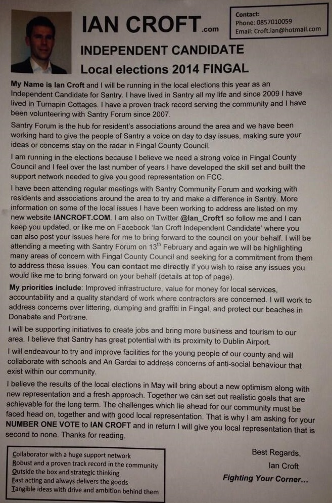 An introduction leaflet from Independent candidate Ian Croft who is running in The Santry/Swords LEA for a seat on Fingal County Council.