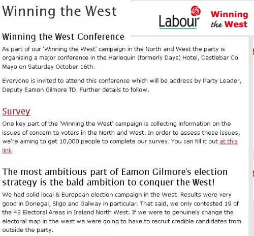 The site says …The most ambitious part of Eamon Gilmore’s election strategy is the bald ambition to conquer the West!
