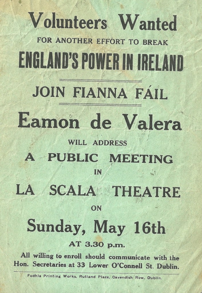 A Flyer for the First Fianna Fáil Public Meeting in The La Scala Theatre on Sunday May 16th 1926.