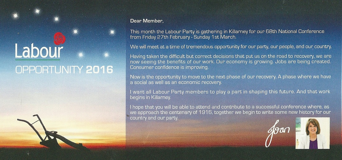 Flyer for the 2016 Labour Party Conference In Killarney February 26, 2015