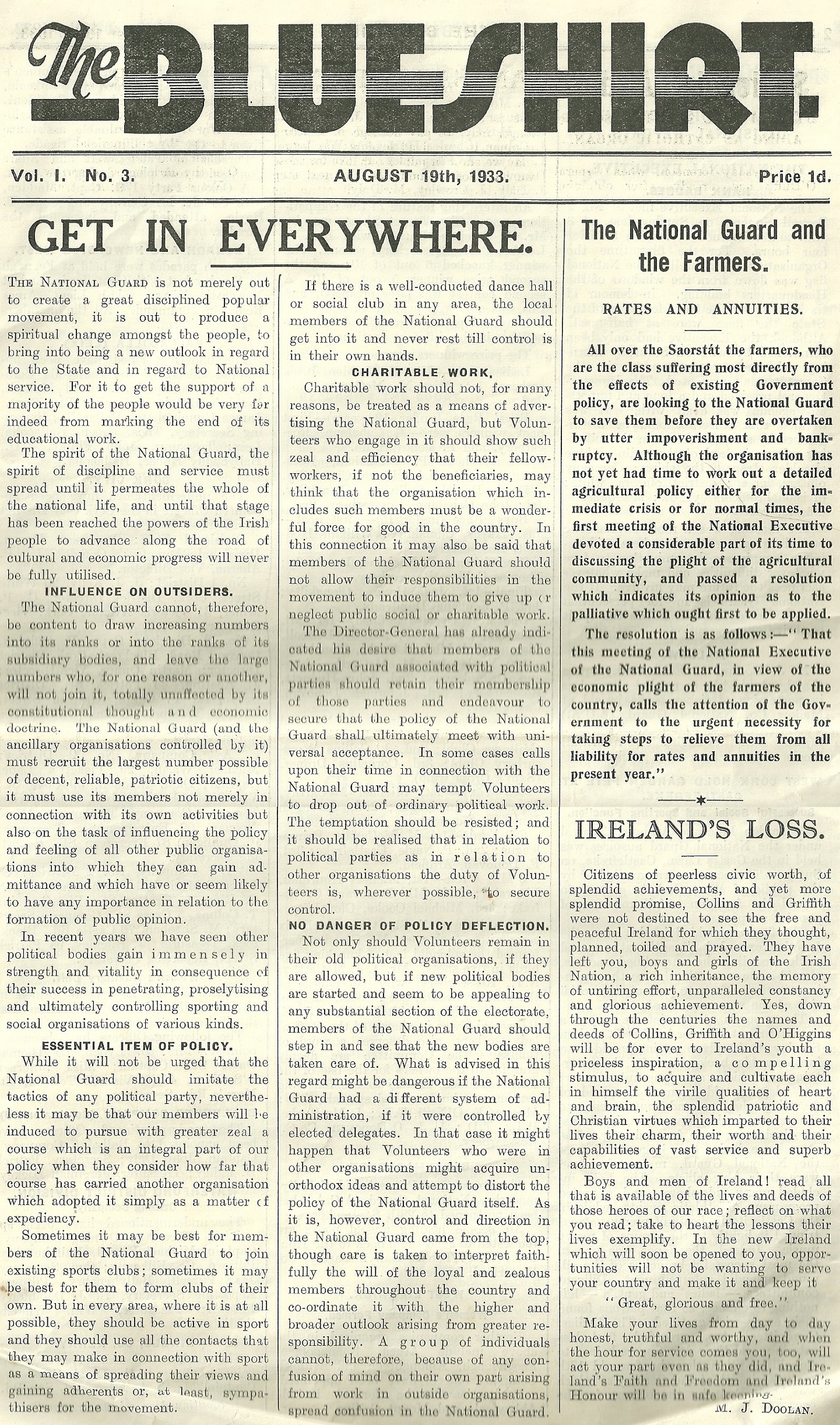 “The Blueshirt” the paper of the National Guard , also known as the Blueshirts from August 19th , 1933. Has details of the groups activity, the rules of the group and so on. A really interesting piece of Irish History. (apologies that it’s not in pdf but the paper was too big for my scanner, so had to scan by half pages and then reunite the pages)