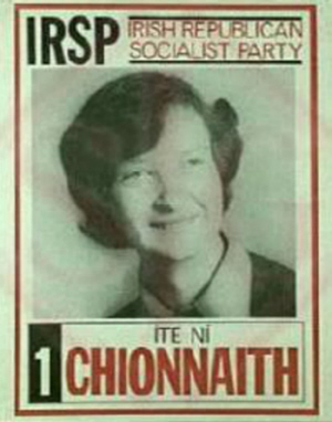 a copy of an election poster for Ite Ni Chionnaith who ran for The Irish Republican Socialist Party in Dublin South West in the June 10th, 1976 by-election.”