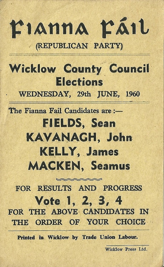 From the 1960 Local Elections a flyer for Fianna Fail candidates Sean Fields, John Kavanagh, James Kelly and Seamus Macken running in Wicklow.