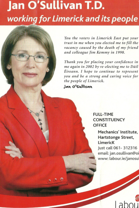 From the 2007 General Election a leaflet from Labour Party candidate Jan O’Sullivan running in Limerick East. O’Sullivan was comfortably elected. Jan O’Sullivan , a former member of Jim Kemmys Democratic Socialist Party, was elected in the 1998 by-election caused by the passing of Jim Kemmy. She has held the seat since.