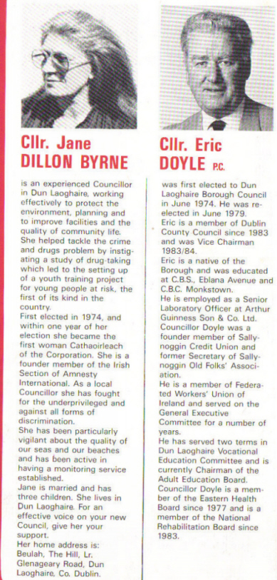 Jane Dillon Byrne is still a councillor and the brief pen pic below only gives brief highlights of her career (another leaflet from 1985 gives a better detail) .She was also a swimming teacher…
