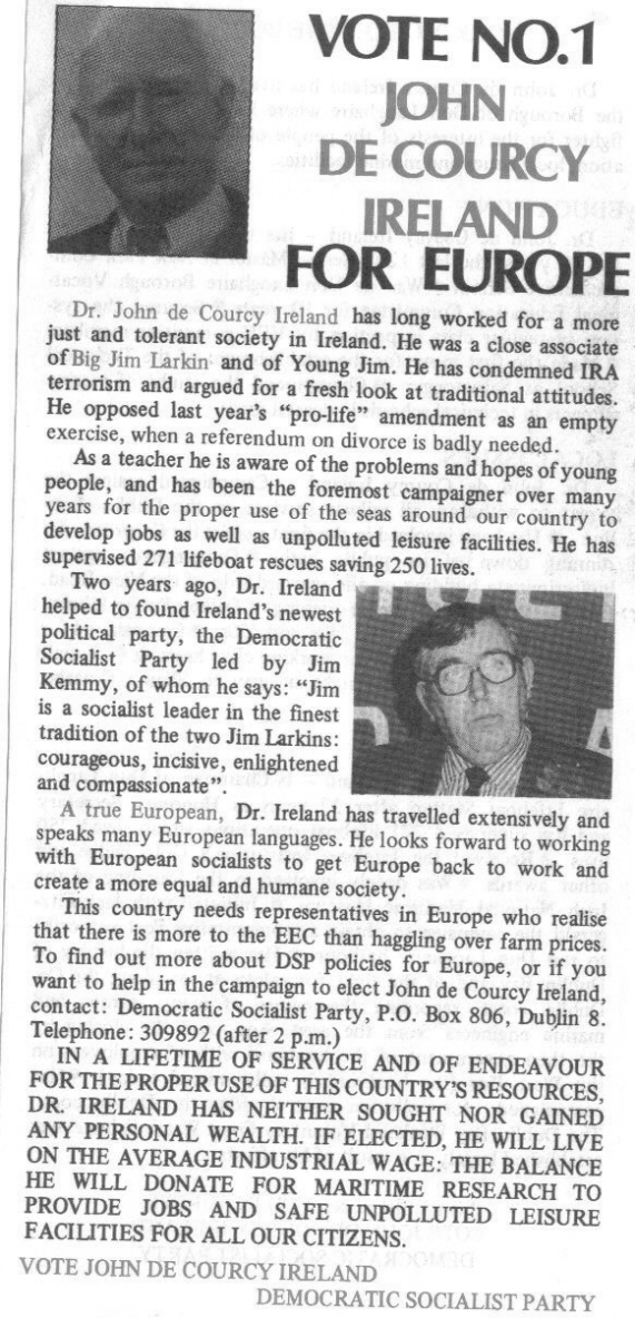 This is from the 1984 Euro Elections. De Courcy Ireland, aside from his political interests was heavily involved in the foundation of the Maritime Museum in Dun Laoghaire. The profile below shows the calibre. He had been Jim Larkins election agent and aside from the DSP, had spells affiliated or involved with the Northern Ireland Labour Party, the Irish Labour Party, the Communist Party of Ireland, the Workers Party, Democratic Left and the Socialist Workers Party. (Party details from Wikipedia)