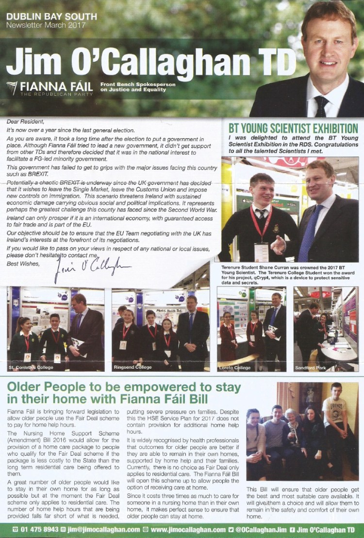 The March 2017 Newsletter from Fianna Fail Dublin Bay South TD Jim O’Callaghan.