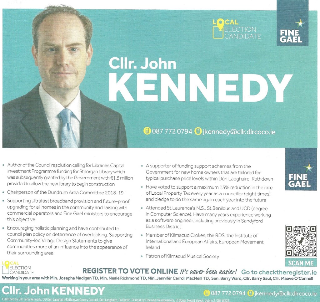A leaflet from John Kennedy who is running for Fine Gael in Stillorgan in the 2024 Local Elections