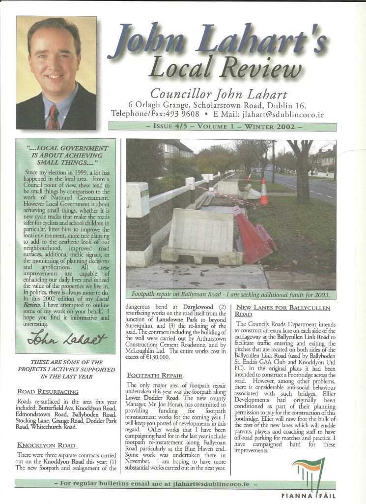 The WInter 2002 edition of then Fianna Fáil Councillor (Now TD) John Lahart’s Local Review. It’s six pages covers lots of issues in the Knocklyon, Rathfarnham area.