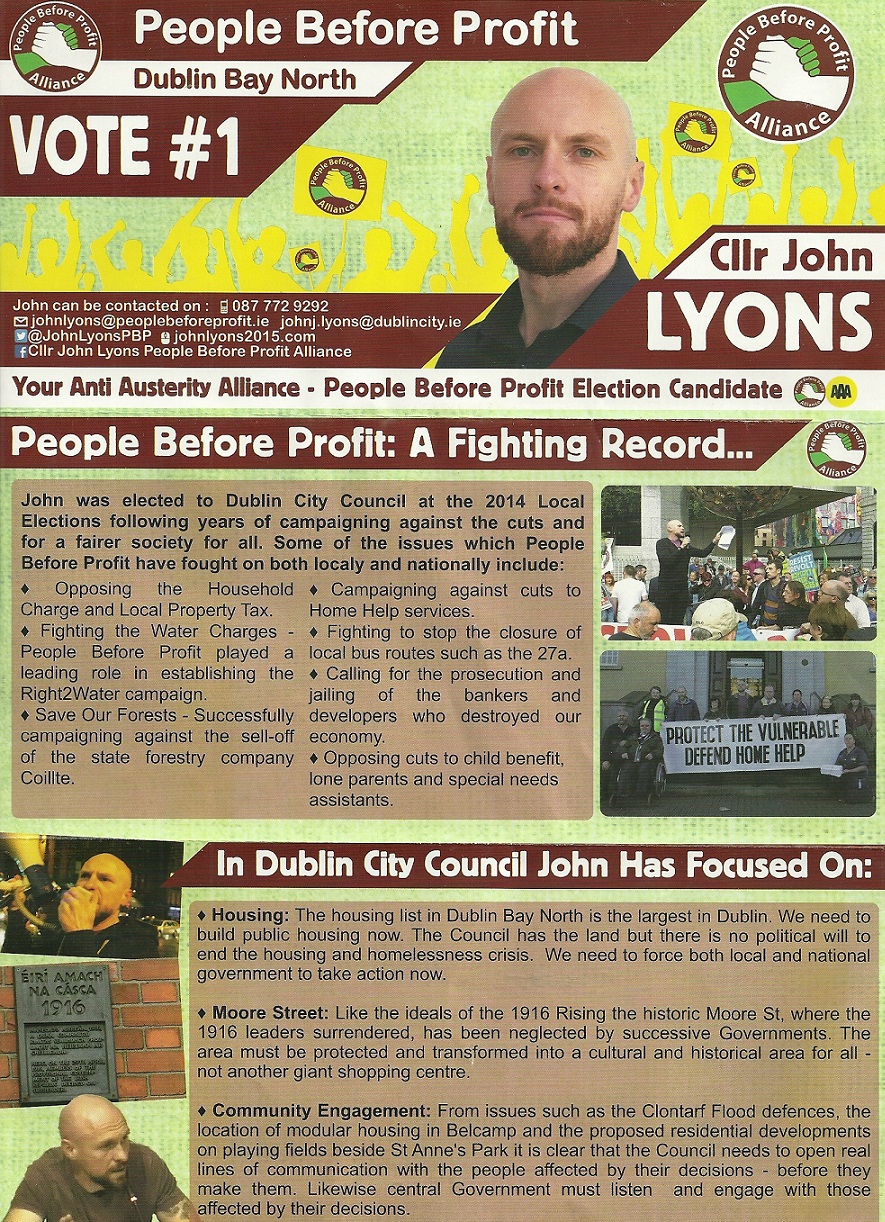 A leaflet from Cllr John Lyons who is running for Anti Austerity Alliance-People Before Profit in Dublin Bay North.