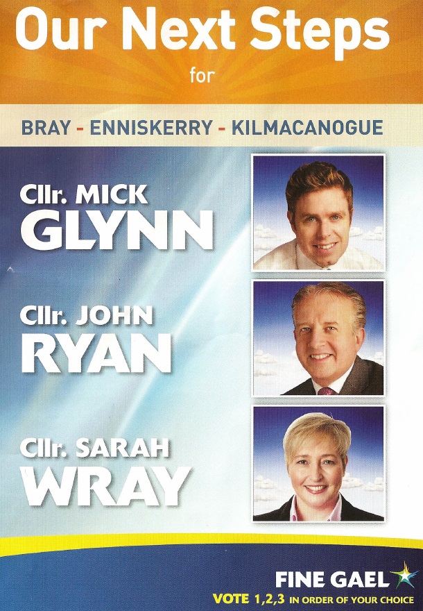 Leaflet from Mick Glynn, John Ryan ,Sarah Wray – Fine Gael -Bray May 9, 2014