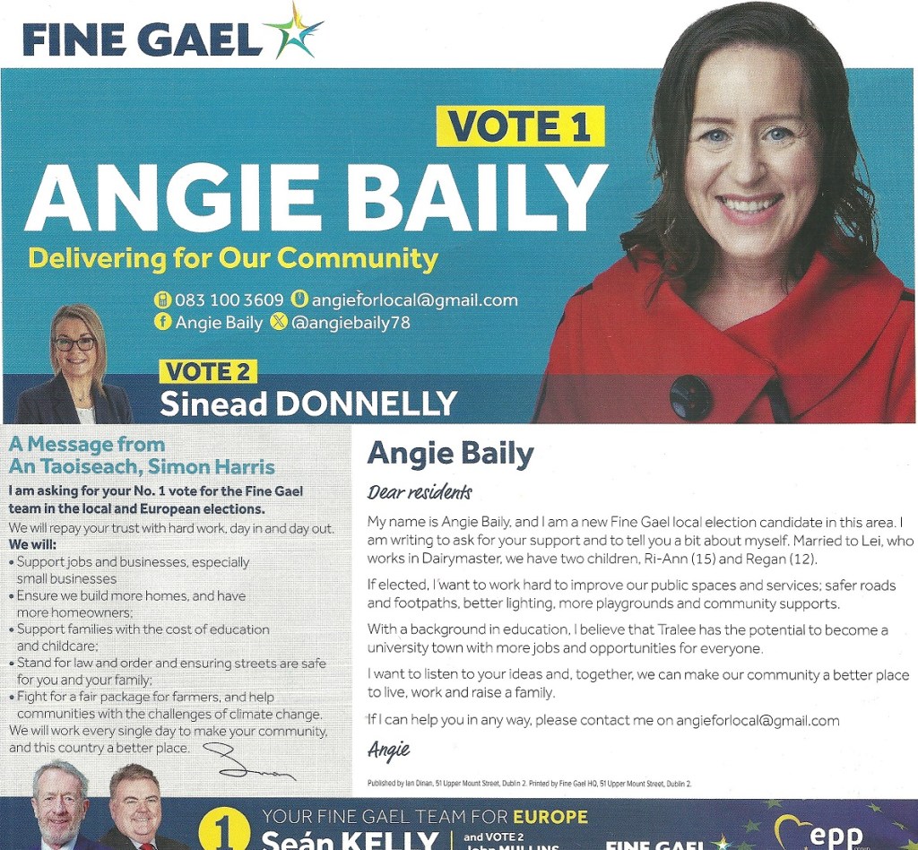 A leaflet form Angie Bailey who is running for Fine Gael in Tralee in the 2024 Local Elections