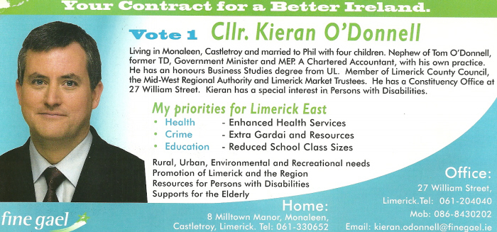 From the 2007 General Election a leaflet for Fine Gael candidate in Limerick East Kieran O’Donnell. O’Donnell polled 5,094 votes and was elected.