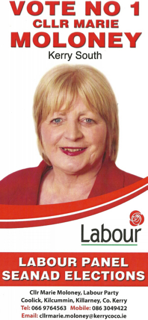 From the 2011 Seanad Elections a flyer from Labour Party candidate Marie Moloney who is running for a seat on the Labour Panel. The Kerry based Moloney is currently deputy Mayor of Kerry.
