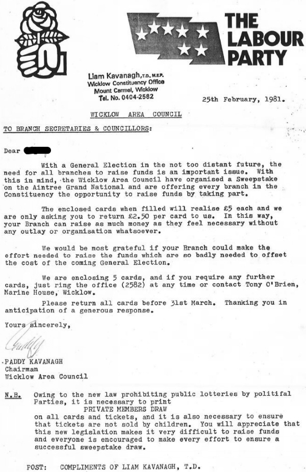 A 1981 fundraising letter from Paddy Kavanagh (with post compliments of Liam Kavanagh) to Labour Party Wicklow members promoting “A Sweepstakes on the Aintree Grand National” .
