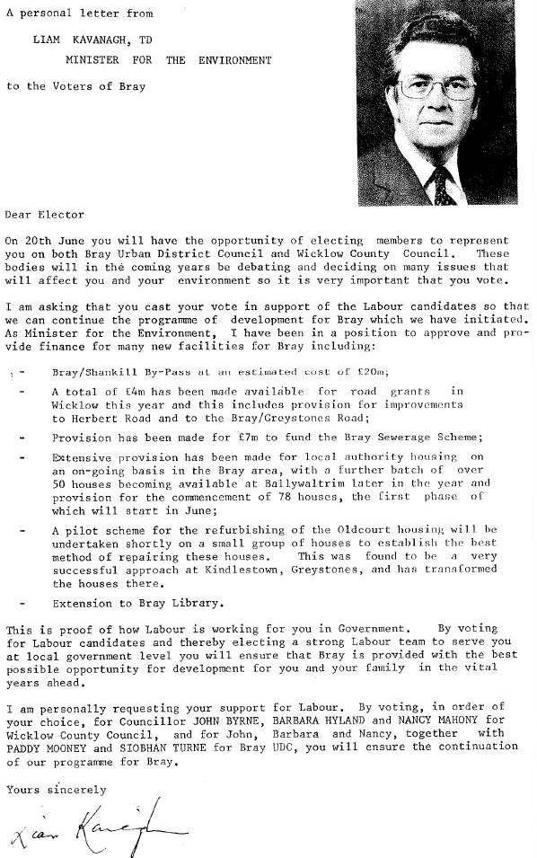 From the 1985 Local Elections a personal letter from Liam Kavanagh Minister for the Environment to the Voters of Bray.