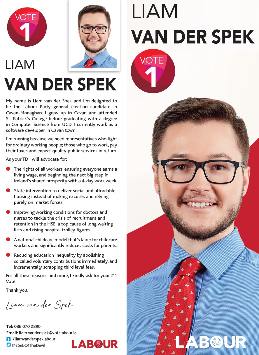 A Leaflet from Liam Van Der Spek of The Labour Party running in Cavan-Monaghan in the 2020 General Election.
