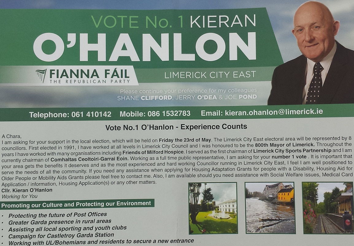 A leaflet from Kieran O’Hanlon who is running for Fianna Fail in Limerick City East for a set on Limerick County Council.