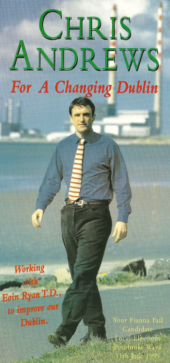From the 1999 local elections, Fianna Fail candidate Chris Andrews running in the Pembroke Ward. Chris Andrews was elected, his running mate Liz Donnelly lost out.