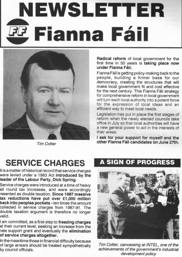 The ‘Newsletter’ of Fianna Fail candidate Tim Cotter in the 1991 Local elections for Kildare County Council, Celbridge LEA. Cotter failed to win a seat.