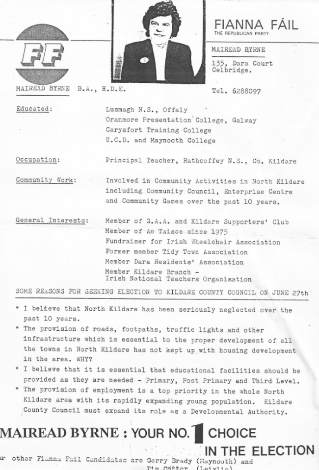 From the 1991 Local Elections, Fianna Fail candidate in Celbridge Mairead Byrne. She polled 488 votes and failed to get elected.