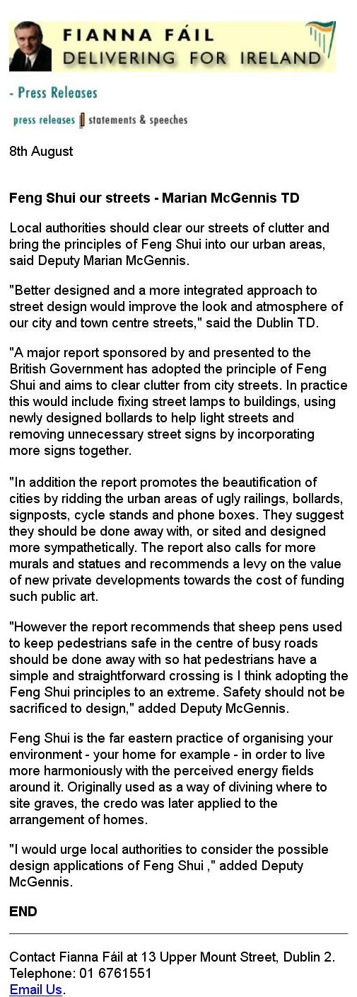Was looking at the Fianna Fail website on archive.org when I came across this bizarre article from 2000. “Feng Shui our streets” an Article from the Fianna Fail Website from Marian McGennis TD.