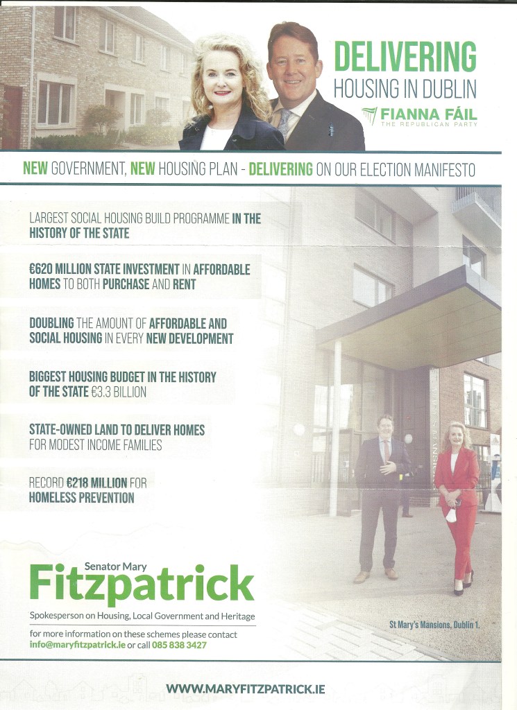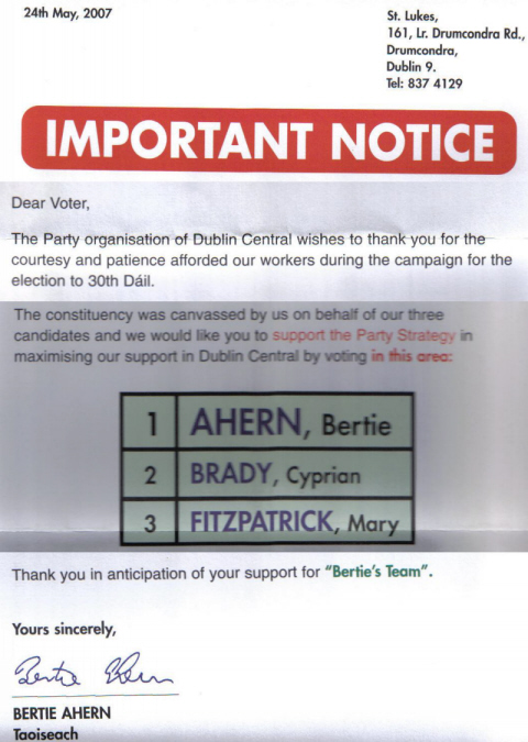 The night before the 2007 General Election, this leaflet was distributed in almost all areas (note the ‘your area’) of Dublin Central (Such stunts are not unusual). Mary Fitzpatrick wasn’t best pleased, especially as she didn’t have time to respond before the election.
