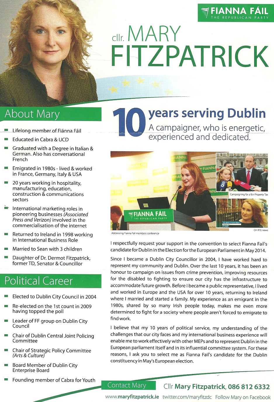 From the Fianna Fail Dublin European Elections Selection convention a leaflet from Mary Fitzpatrick who is running for the nomination.