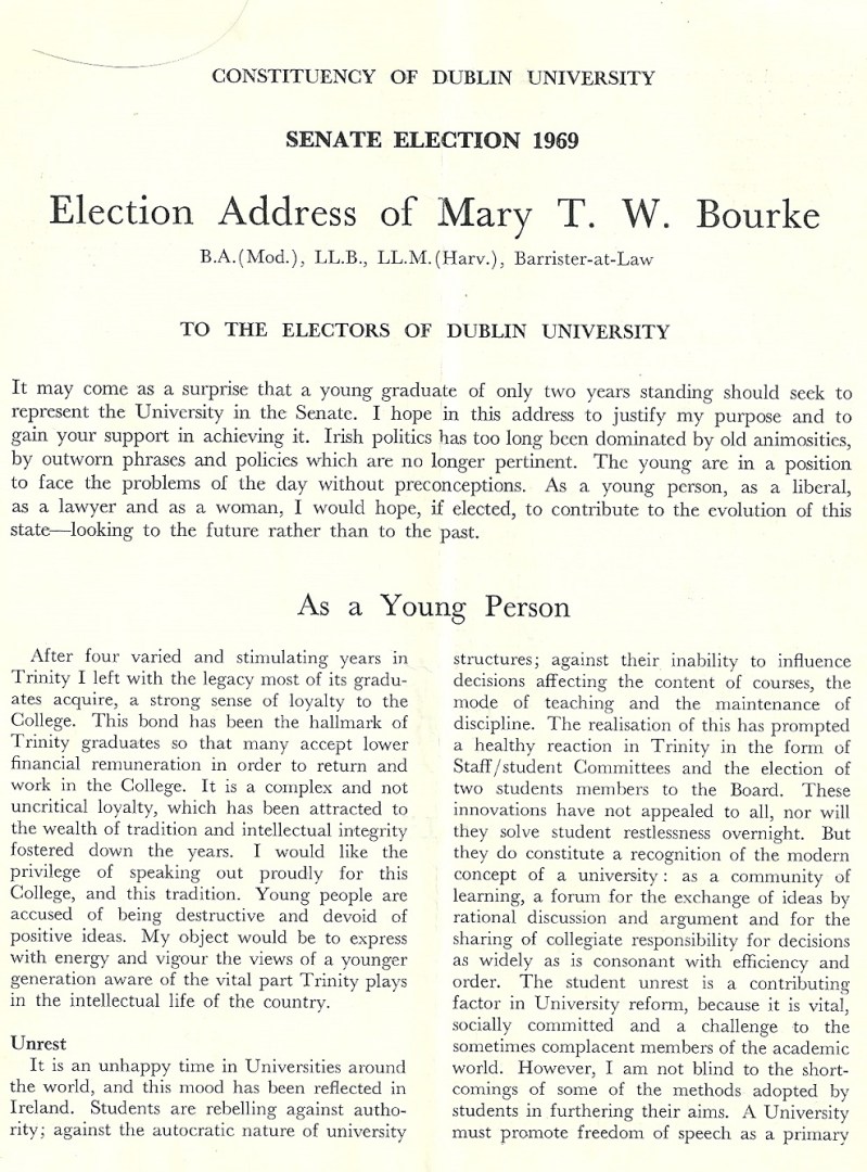 From the 1969 Seanad Elections for the Dublin University Constituency a leaflet from Mary T. W. Bourke who was running in her first Seanad election. She was elected and held her seatuntil her election to the Office of President of Ireland in 1990 as Mary Robinson.