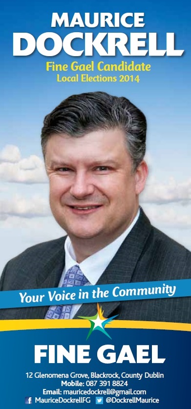 A leaflet for Fine Gael Blackrock candidate Maurice Dockrell who is running for a seat on Dun Laoghaire Rathdown County Council. Four generations of his family have represented Dun Laoghaire and Blackrock at local and National level. Dockrell is a name steeped in the history of Dun Laoghaire.