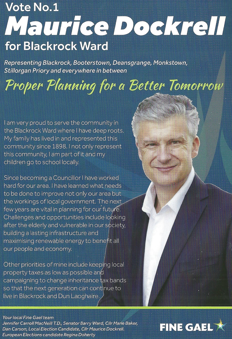 A leaflet from Maurice Dockrell who is running for Fine Gael in Blackrock in the 2024 Local Elections