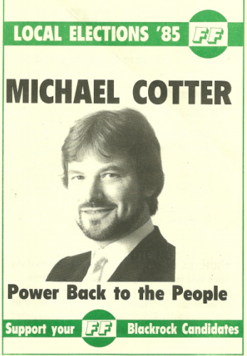 From the 1985 Local Elections in the Blackrock Ward, Fianna Fail candidate Michael Cotter. Michael Cotter failed to be elected and stood again in 1991 without success.