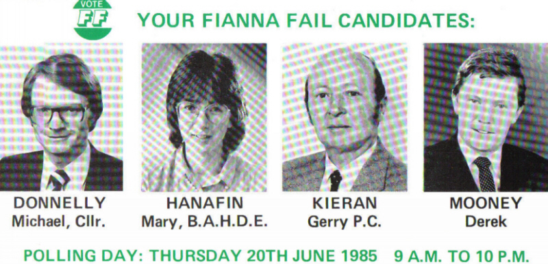 A young Mary Hanafin in her fisrt electoral outing in Rathmines 1985. Both Hanafin polling 890 votes and Donnelly polling 2133 votes were elected. Derek Mooney polled 534 votes and Gerry Kieran 849 votes and both missed out.