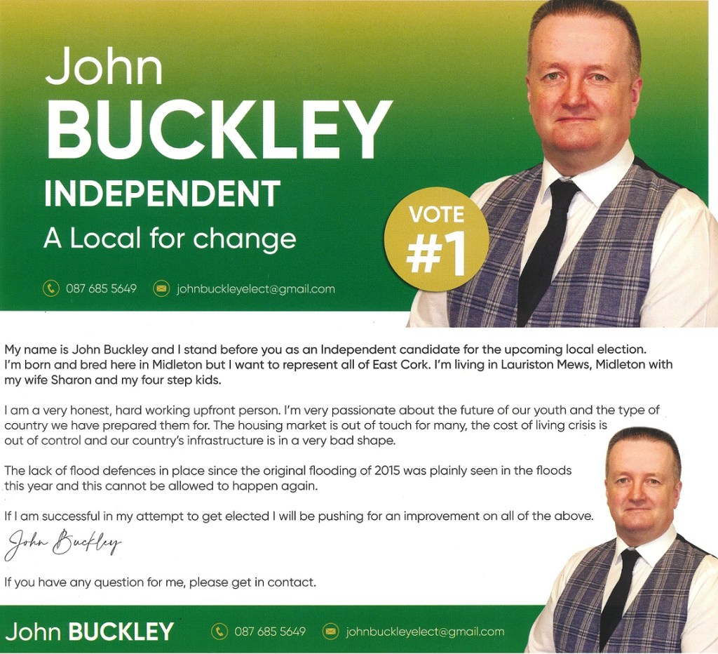 A leaflet from John Buckley who is running as an Independent in Midleton in the 2024 Local Elections