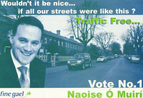 A traffic themed leaflet from Fine Gael candidate Naoise Ó Muirí running in the 2004 Local Elections in the Clontarf ward. Ó Muirí was elected and returned again in the 2009 Local Elections.