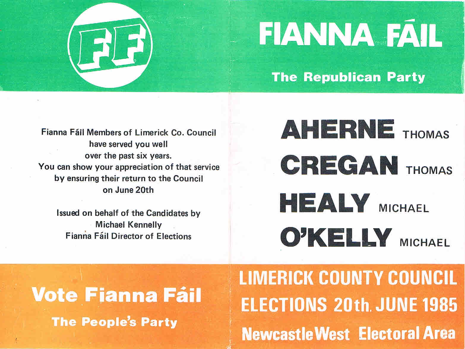From the 1985 Local Elections a leaflet for Thomas Aherne, Thomas Cregan, Michael Healy and Michael O’Kelly running for Fianna Fail in NewcastleWest. All of them were elected.
