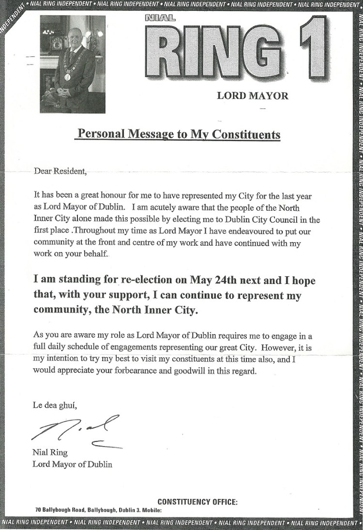 A Leaflet from Nial Ring running as an Independent in the North Inner City LEA for a seat on DUblin City Council.