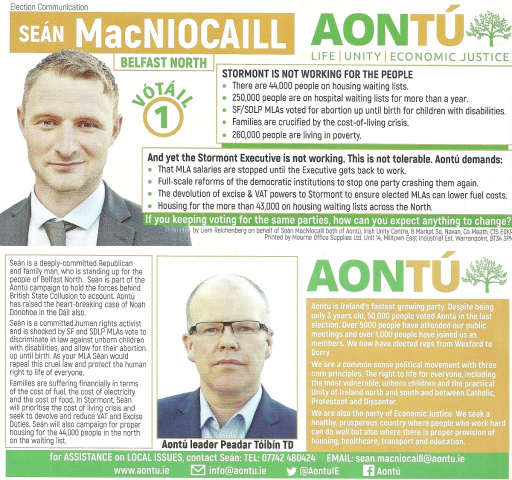 A leaflet from Seán MacNiocaill who is running for Aontú in North Belfast in the 2022 Assembly Elections. Many thanks to the sender.