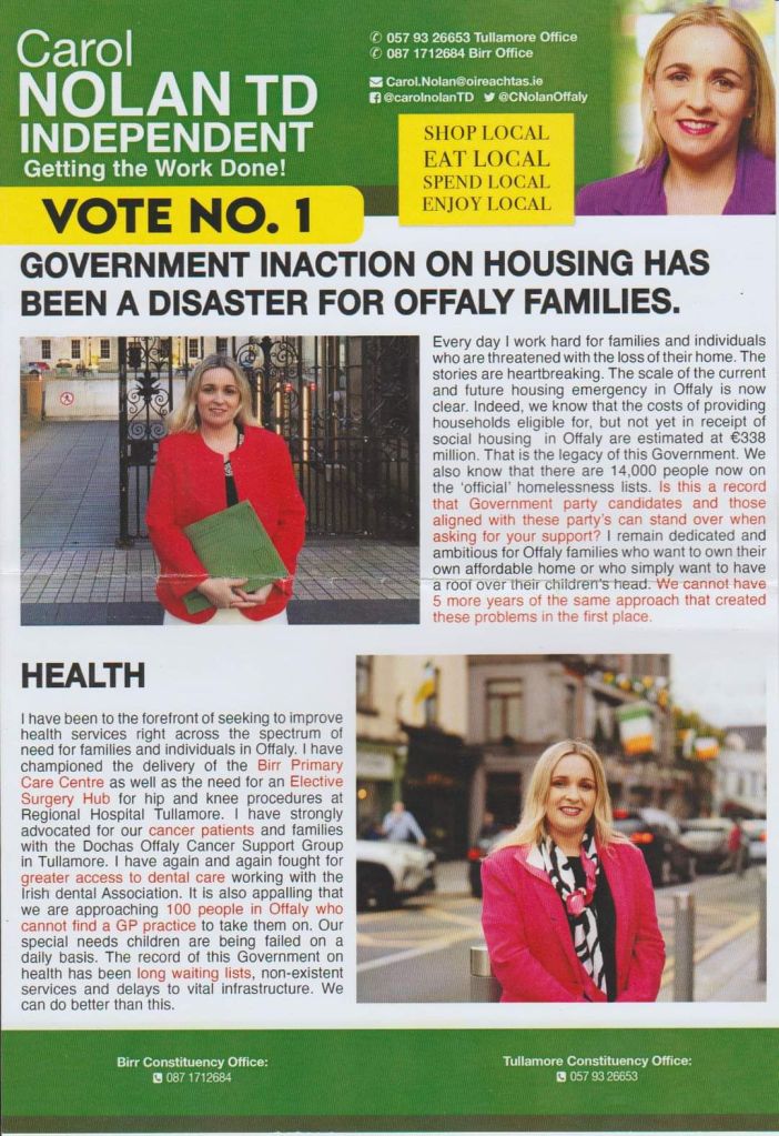 A Leaflet from Carol Nolan who is running as an Independent in Offaly in the 2024 General Election.