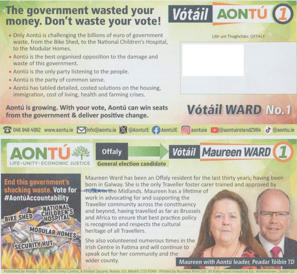 A leaflet from Maureen Ward who is running for Aontú in Offaly in the 2024 General Election.