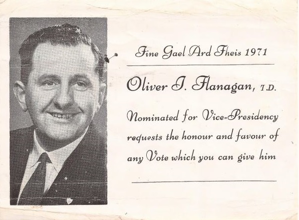 From the 1971 Fine Gael Ard Fheis a flyer from legendary Fine Gael TD Oliver J. Flanagan who was running for the Fine Gael Vice Presidency.