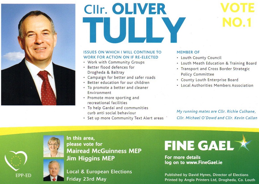 Leaflet from Oliver Tully -Fine Gael – Drogheda -2014 Local Elections April 28, 2014