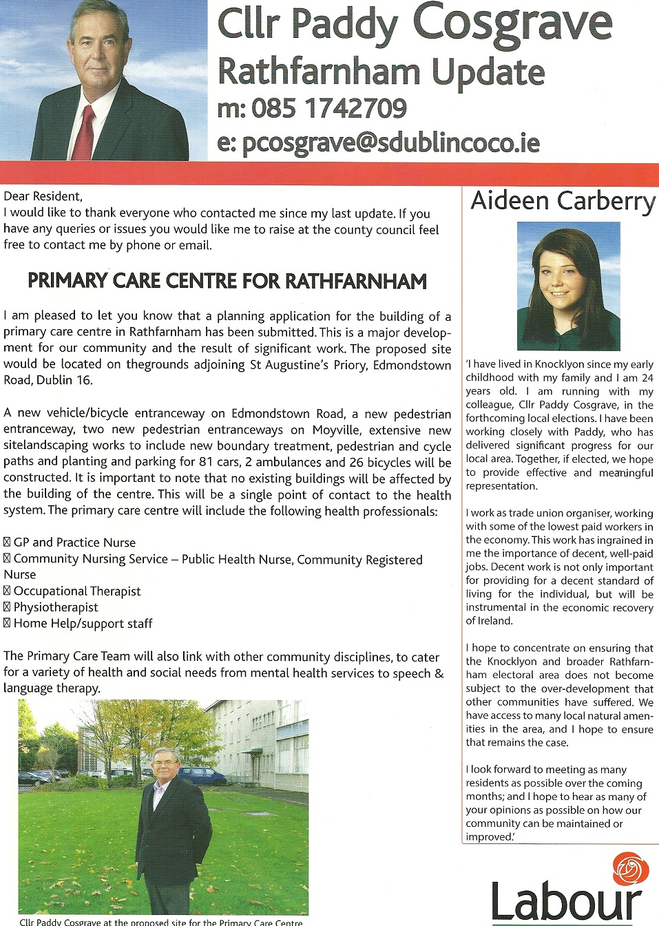 A ‘Rathfarnham Update’ newsletter from Labour Rathfarnham Councillor Paddy Cosgrave. The update as well as local news also includes a profile of his running mate in the Local Elections Aideen Carberry.