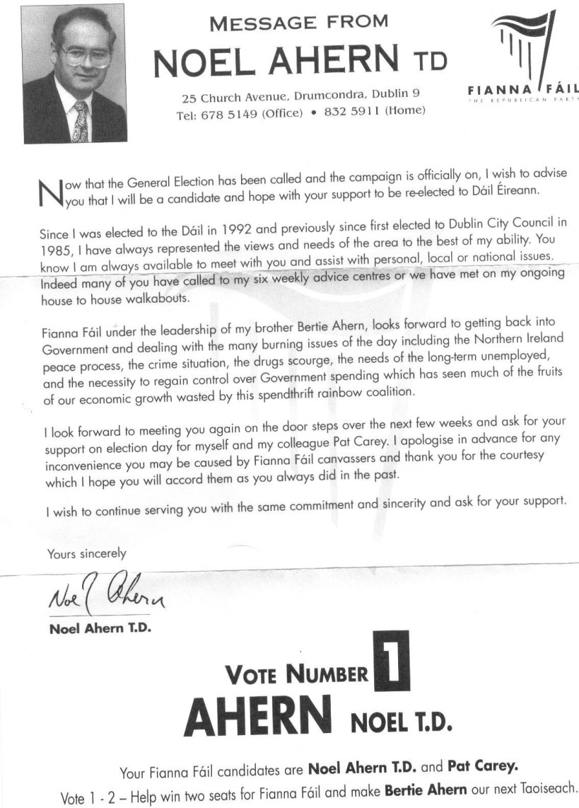 From 1997 a flyer for Noel Ahern “Brother of Bertie Ahern Leader of Fianna Fail” and Pat Carey running for Fianna Fail in Dublin North West.