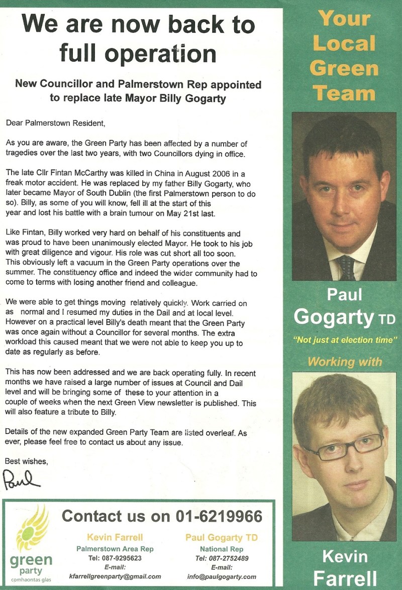 From 2007 following the sad passing of Billy Gogarty and Fintan McCarthy, a leaflet from Paul Gogarty and The Green Party in Palmerstown outlining the changes to the party reps in the area. Paul Gogarty was the TD for the area, Dorothy Corrigan became a Councillor, Louise Archbold was the Young Greens Rep , Kevin Farrell along with Tom Dowling were the new Palmerstown Reps.