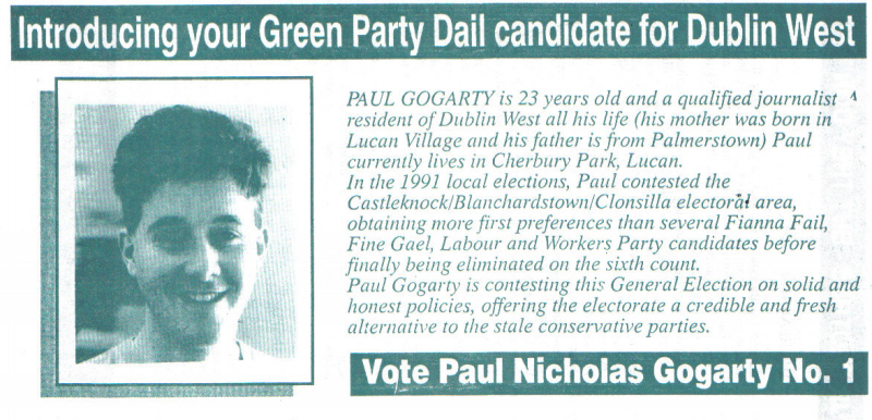 Paul Gogarty in 1992. Nice little history of the Greens in Dublin West as well as some catchy slogans…”Other Parties try to steal our clothes but they dont fit” .